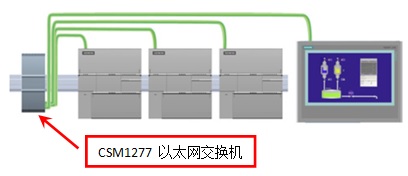 当两个以上的通信设备进行通信时,需要使用交换机来实现网络连接。可以使用导轨安装的西门子 CSM1277 4端口交换机来连接多个 CPU 和 HMI 设备,如图 3. 多个通信设备的网络连接所示。