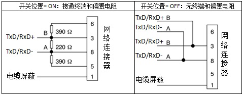 网络连接器上两组连接端子,用于连接输入电缆和输出电缆。网络连接器上具有终端和偏置电阻的选择开关,网络两端的通信节点必须将网络连接器的选择开关设置为 On ,网络中间的通信节点需要将选择开关设置为 Off 。典型的网络连接器终端电阻和偏置电阻接线如表 4. 网络连接器终端和偏置电阻所示。