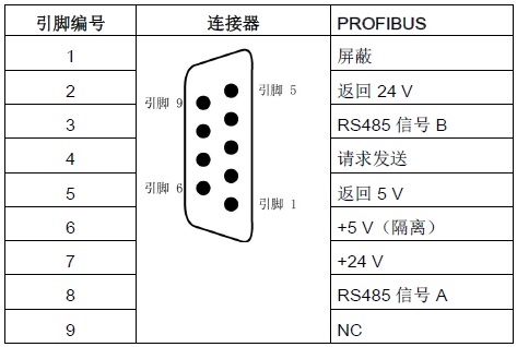 EM DP01 上的 RS485 串行通信接口是一个 RS485 兼容的九针迷你 D型插口,与欧洲标准 EN 50170 规定的 PROFIBUS标准一致,下图介绍了通讯端口的引脚分配。