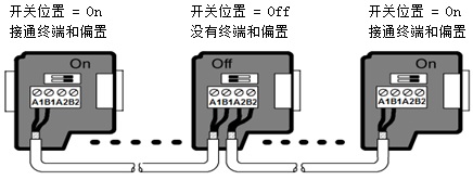 注意圆圈内的"终端电阻"开关设置。网络终端的插头,其终端电阻开关必须放在"ON"的位置;中间站点的插头其终端电阻开关应放在"OFF"位置。