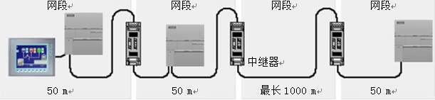 网络中添加中继器允许将网络再延长 50m ,如果两台中继器连接在一起,中间无其它节点,则可将网络延长 1000m ,一个网络中最多可以使用 9 个西门子中继器。如图 4. 使用 RS485 中继器拓展网络所示。