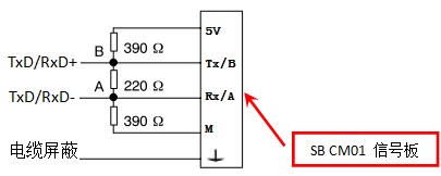 使用 SB CM01 信号板可用于连接 RS485 网络,当信号板为终端通信节点时需要接终端电阻和连接偏置电阻,典型的电路图如图 6. SB CM01 信号板终端和偏置电阻接线图所示。