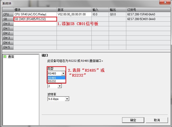 使用STEP 7-Micro/WIN SMART 软件组态 SB CM01 信号板为 RS485通信端口或者RS232通信端口的过程如图 1. SB CM01 信号板组态过程所示。